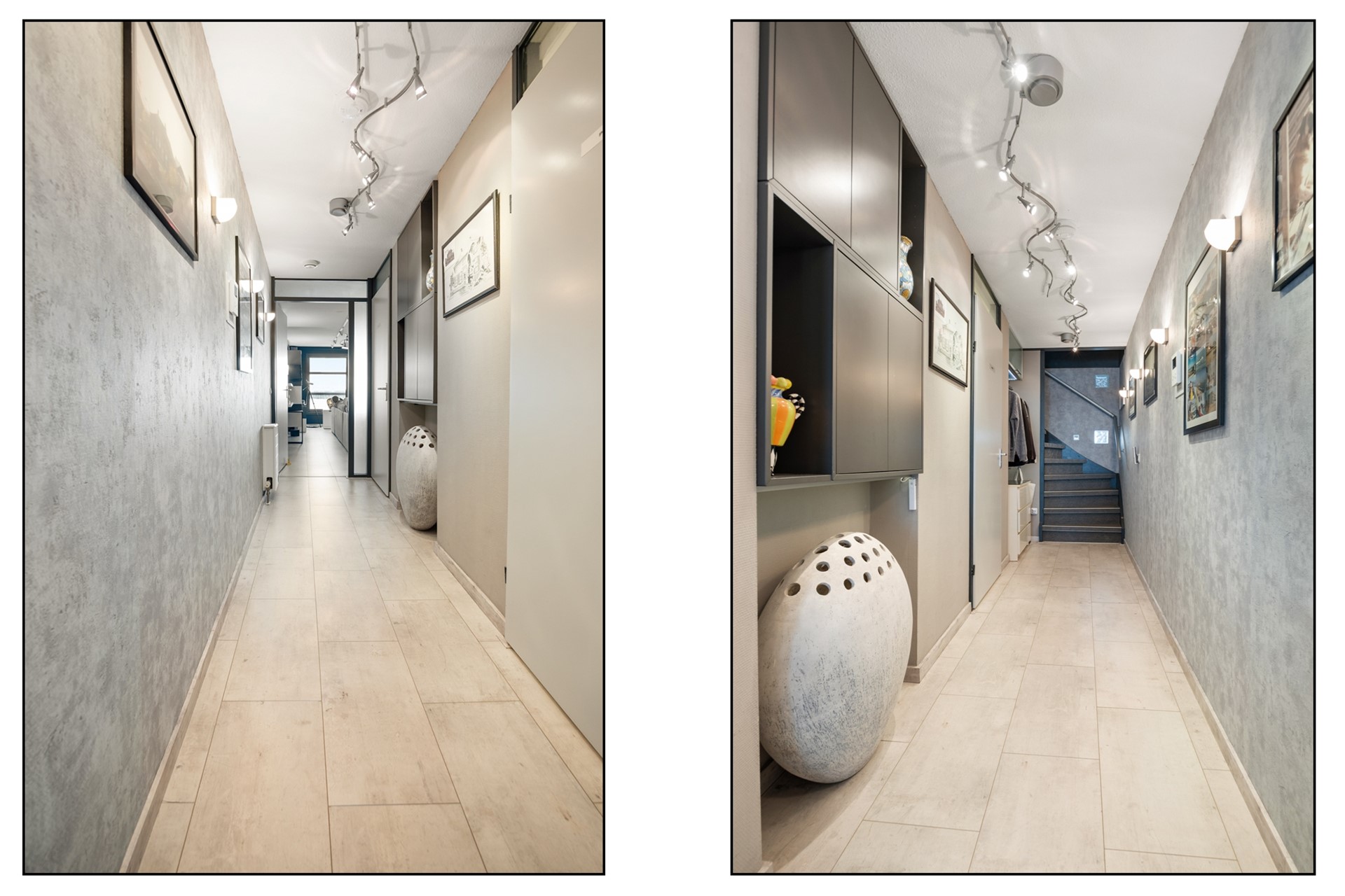 A spacious entrance with access to the storage rooms and a staircase to the parking garage as well as an elevator to the upper floors. For those who wish, the beautiful modern staircase will take you to the floor of your destination.