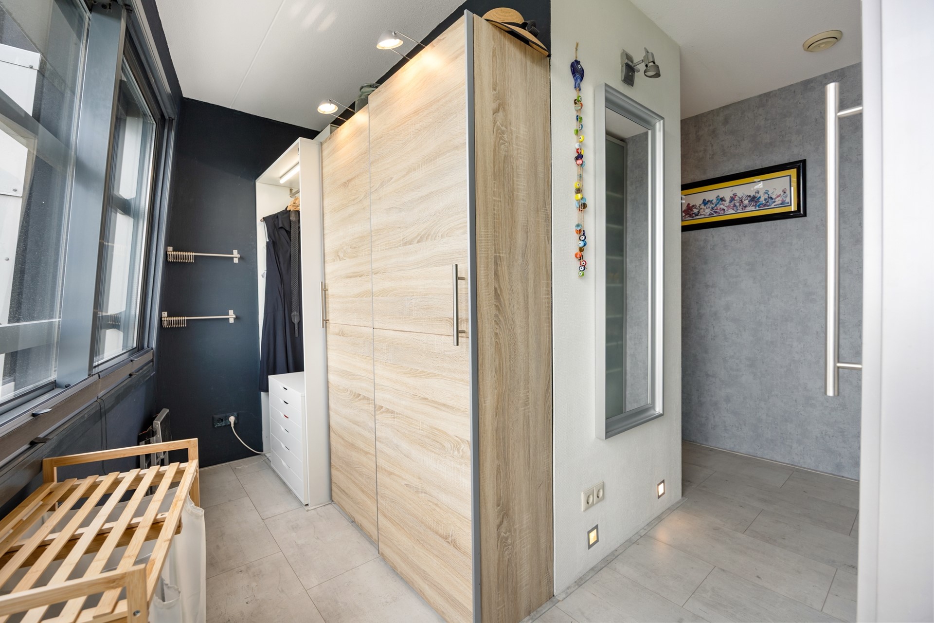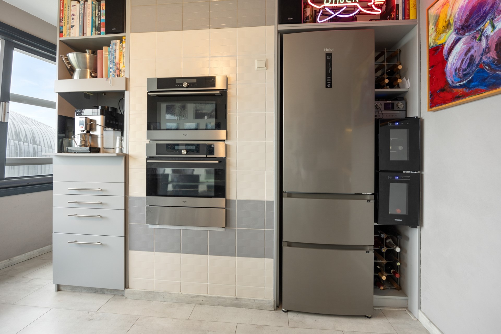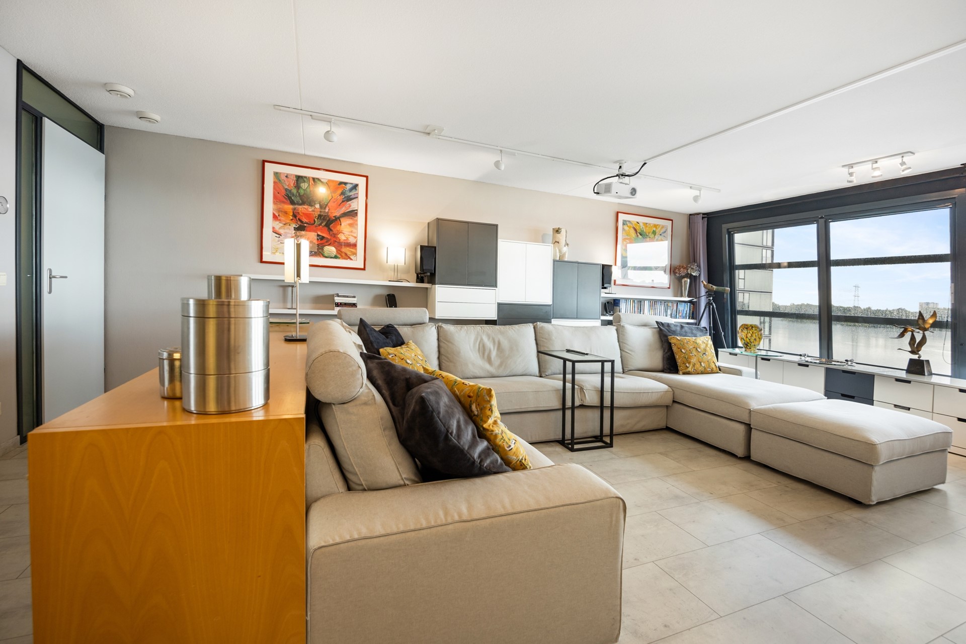 Second floor At the bottom of the stairs, you go through a long and bright hallway to the beautiful large open living space with a spectacular view. This living room has a large, wall-wide window with a stunning view over the Weerwater, one of Almere's largest and most beautiful bodies of water. Through all seasons, you can open the windows and let outdoor life literally flow inside. Wonderful! This maisonnette is designed so that the necessary 'kitchen space' does not come at the expense of the living area. Midway through, the kitchen has been cleverly placed along the interior wall. It is equipped with various branded appliances such as a dishwasher, oven/microwave, induction cooktop, and extractor hood. Furthermore, the kitchen layout includes a cleverly positioned separate fridge/freezer and two separate wine coolers. There is also a special space made for setting up a coffee machine. By choosing this entire kitchen setup, the beautiful view from 'water to city' has been preserved. As you walk through, you enter the living kitchen, with a view of the lively city center. The 'corner turn' gives you access to a cleverly placed workspace. Out of sight, this is an ideal spot for working from home, or study. Back to the long and bright hallway. Here you will also find some storage space and a very functionally designed bathroom, Shower/steam unit equipped with underfloor heating. The spacious separate toilet area has also been fully modernized and features beautiful tiling and a wall-hung toilet combination