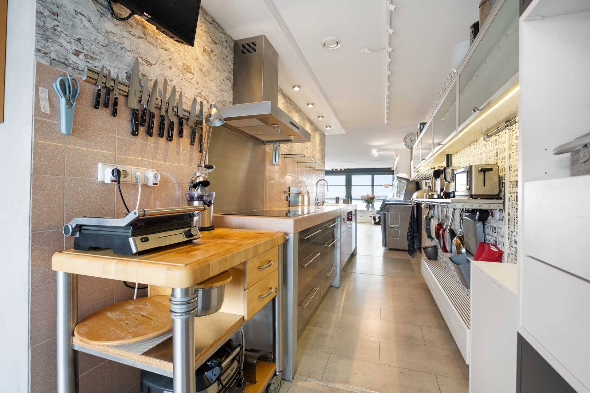 - Aan de binnenwand geplaatste multifunctionele keuken in lengterichting;