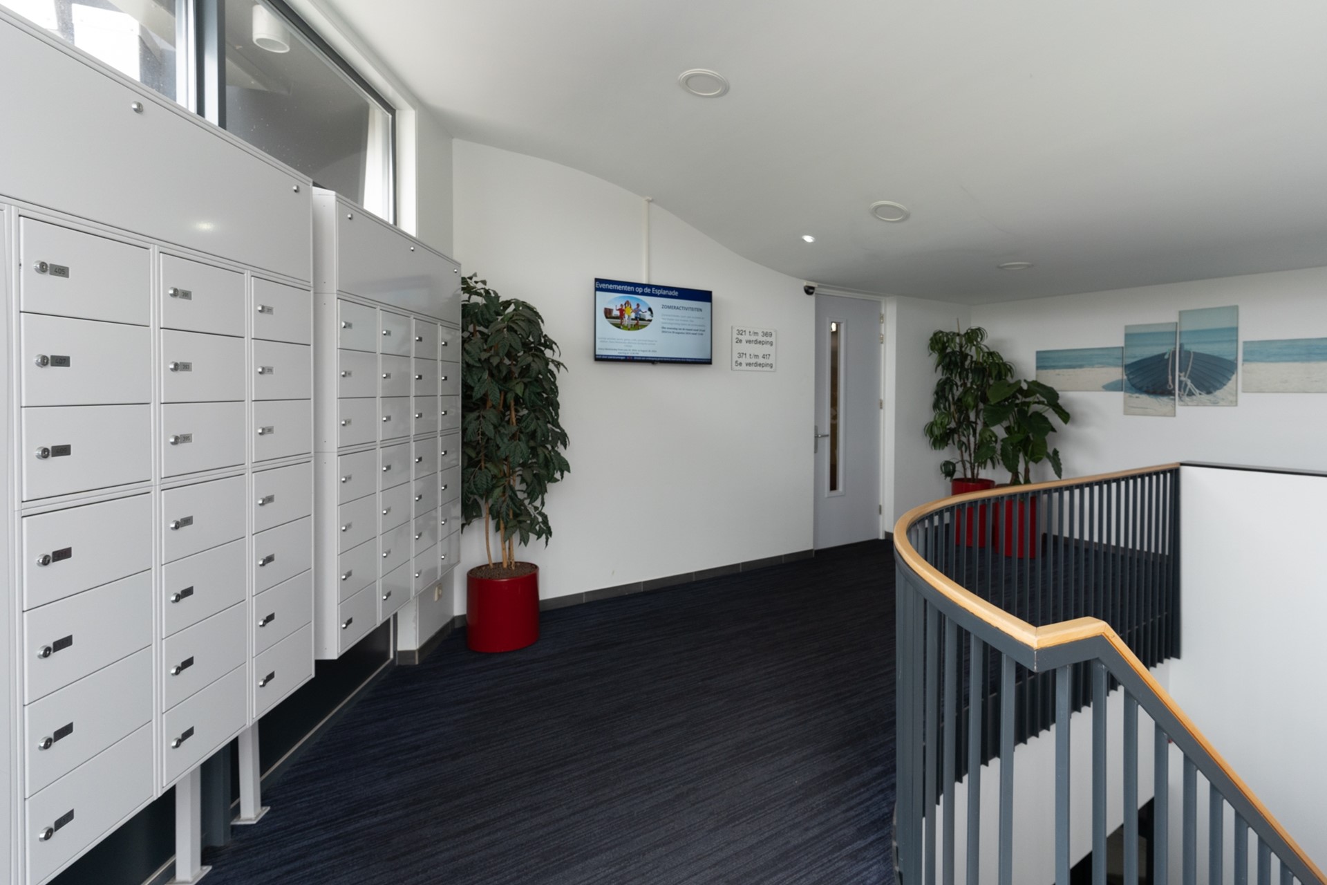 Op de begane grond van dit bijzondere gebouw "The Wave" bevindt zich een ruime entree met toegang tot de bergingen en een trap naar de parkeergarage alsmede een lift naar de verdiepingen. Voor wie wil neemt het mooie moderne trappenhuis je naar de etage van je bestemming.
